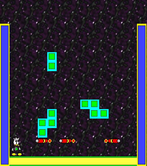 Don’t mistake this as an regular puzzle game, like Tetris. While it has the word Tetris in it’s title, the concept is not about lining up a row of blocks to make them disappear from the screen, but to try prevent any falling blocks from hitting the ground. Catching all the blocks in a room advances the player to the next one. If an block hits ground, or you get hit by a missile, you’ll lose a life. Clearing all rooms let’s you enter your name at the highscore table. After closing the highscore table, the game restarts from the beginning again.