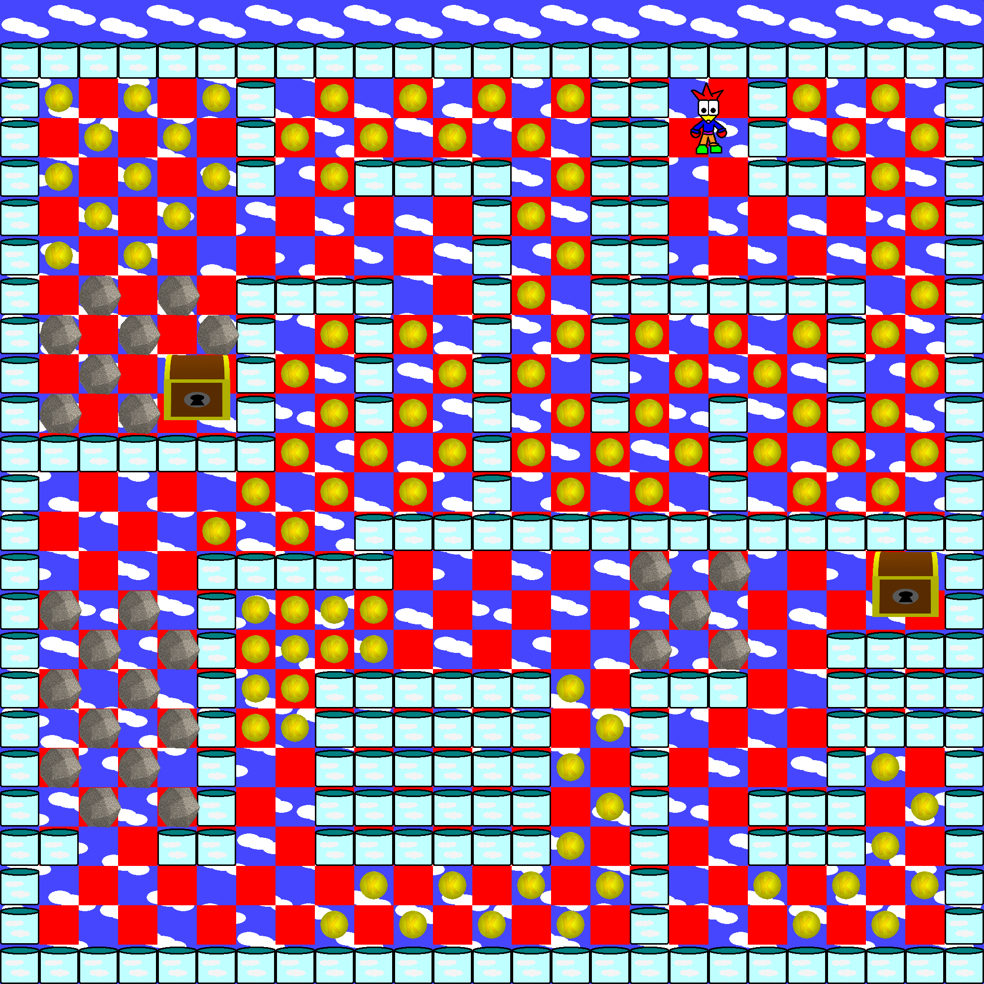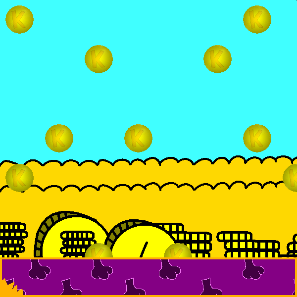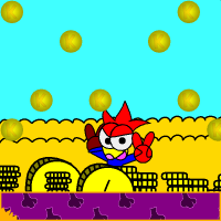 Kazooa now appears in the scene. The layer with coins was changed to a sprite-based object to make it appear in front of the Kazooa and the falling coins.