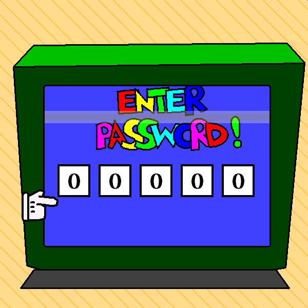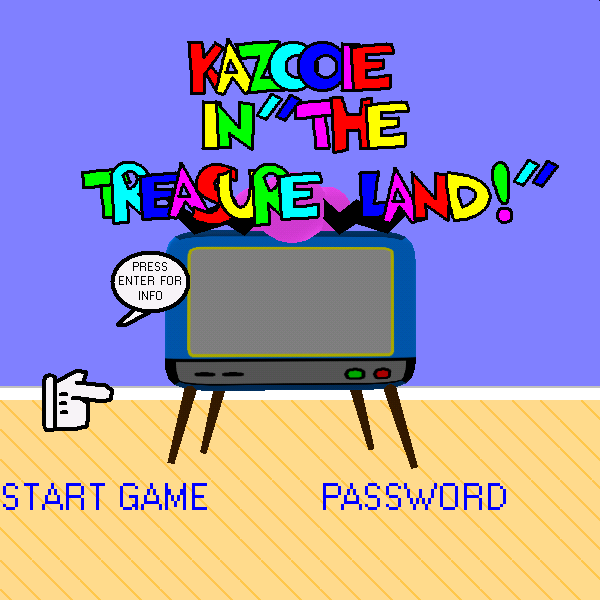 Title screen is now just like the final version, except the title logo remaining unchanged, "START" and "PASSWORD" are more basic-looking similar to Crower VS The Time, info bubble is the same, cursor is still the white gloved one from CVSTT, TV screen is all gray, and no copyrights at the bottom. The password screen is no longer a part of the title screen room.