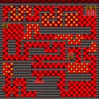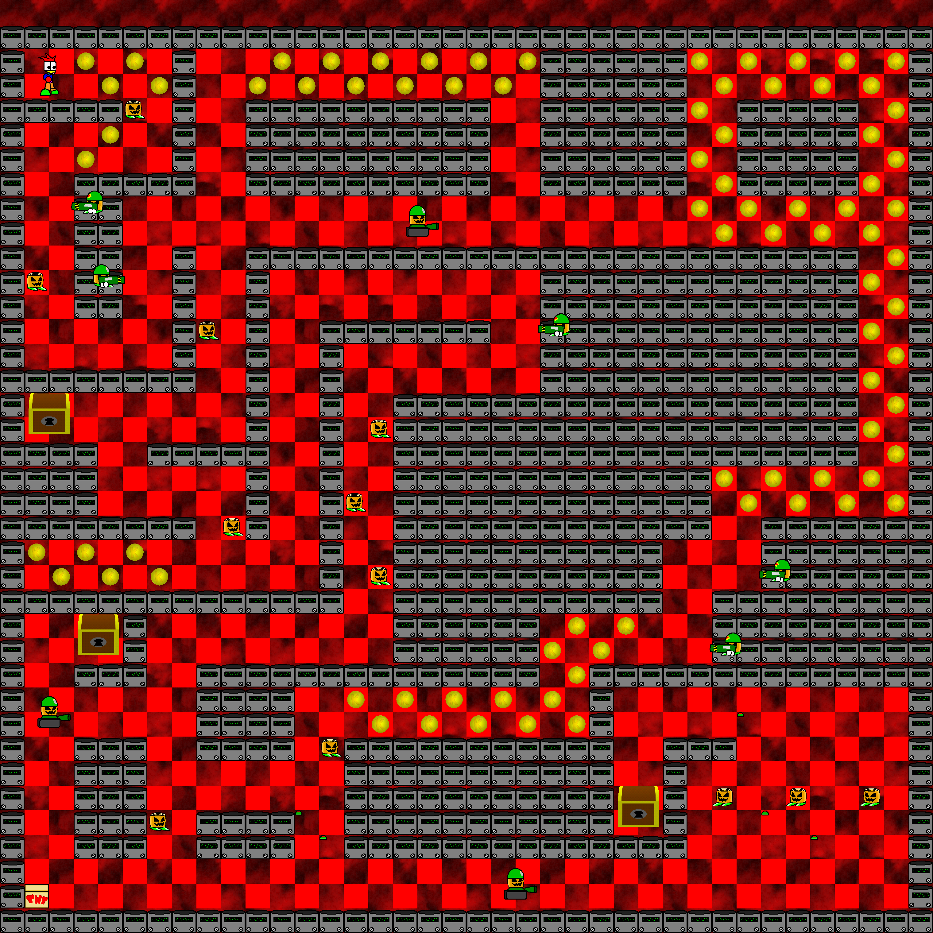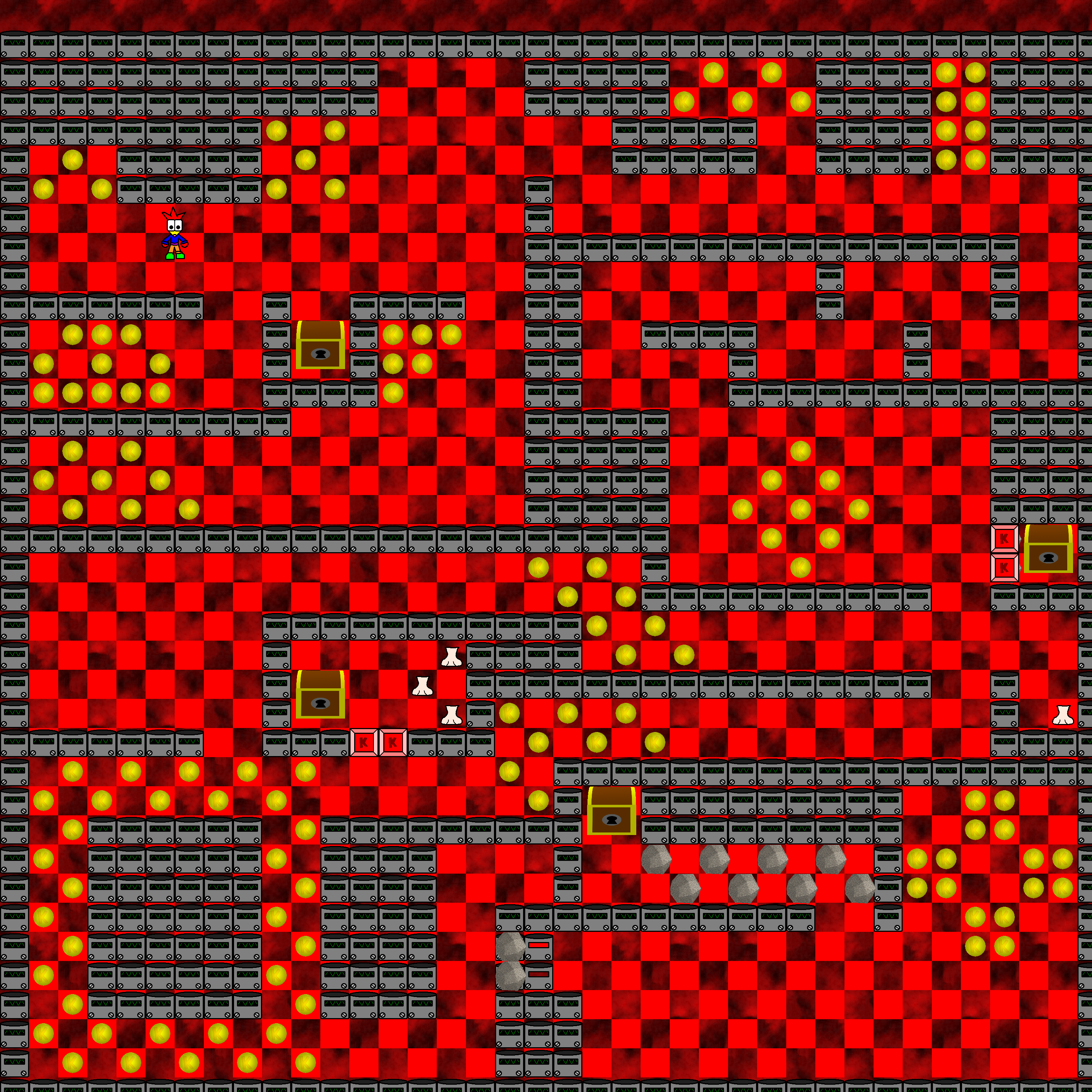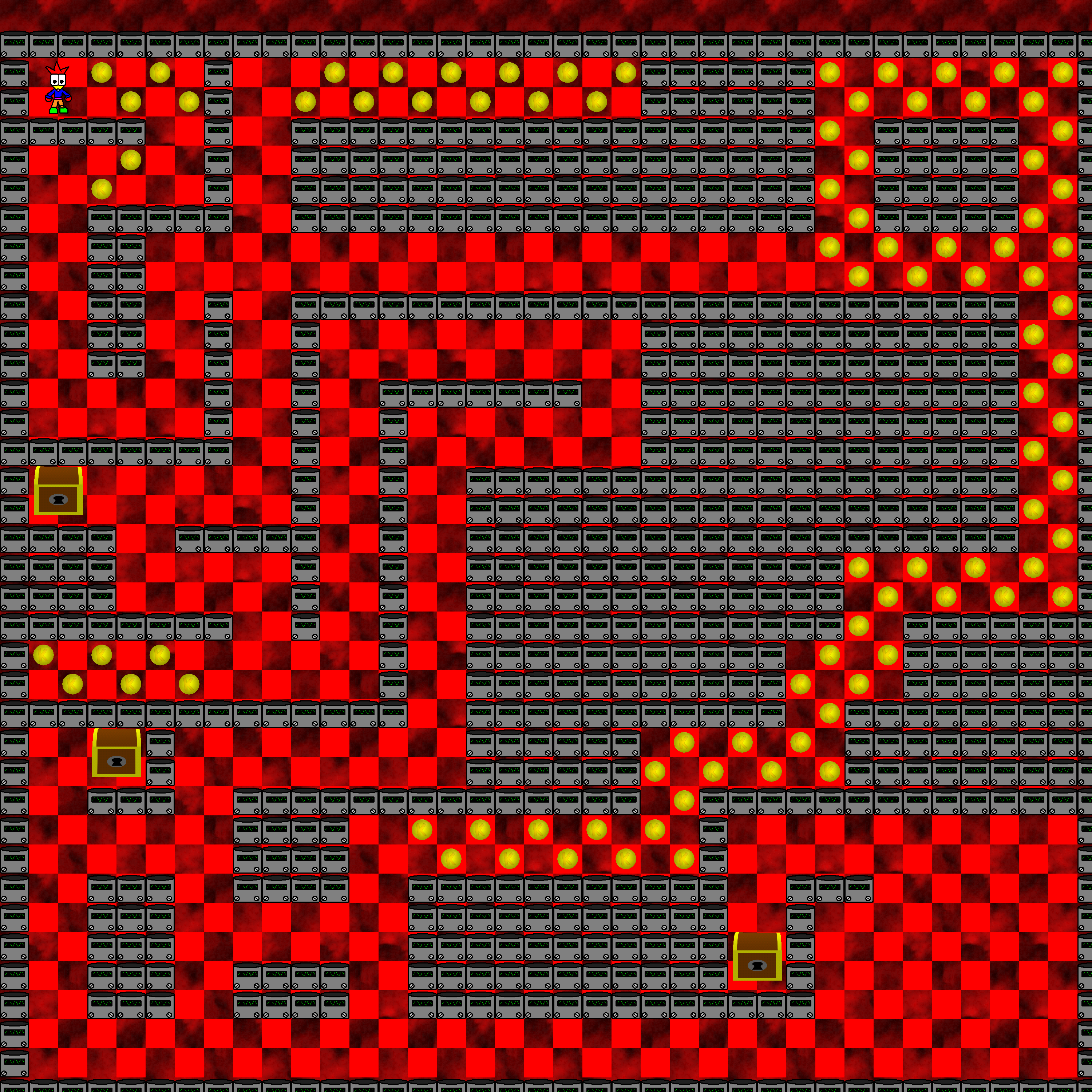 Level has been redesigned to work around performance issues on WinXP(at the time early development of the game occured, that is.). The wall graphic was changed to a torch-like thing where the flames would be. It was reverted back due to the possibility of having to place separate flame objects on top of them, which would have made the game's frame rate dip down considerably, and the graphic not looking very good.